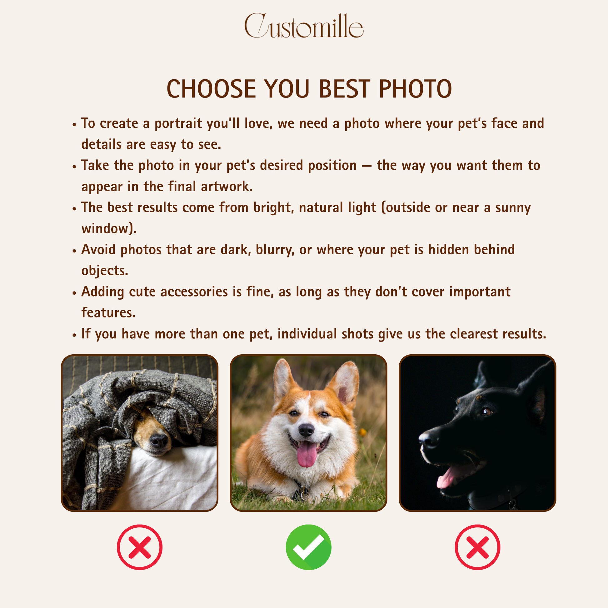 Absolutely! We can feature multiple pets in the same portrait. For one pet, we use a vertical orientation, and for more than one pet, we automatically use a horizontal orientation for the best composition and overall look. Just upload clear photos of each pet and let us know which name belongs to which — we’ll arrange them beautifully to create a balanced and personalized design.